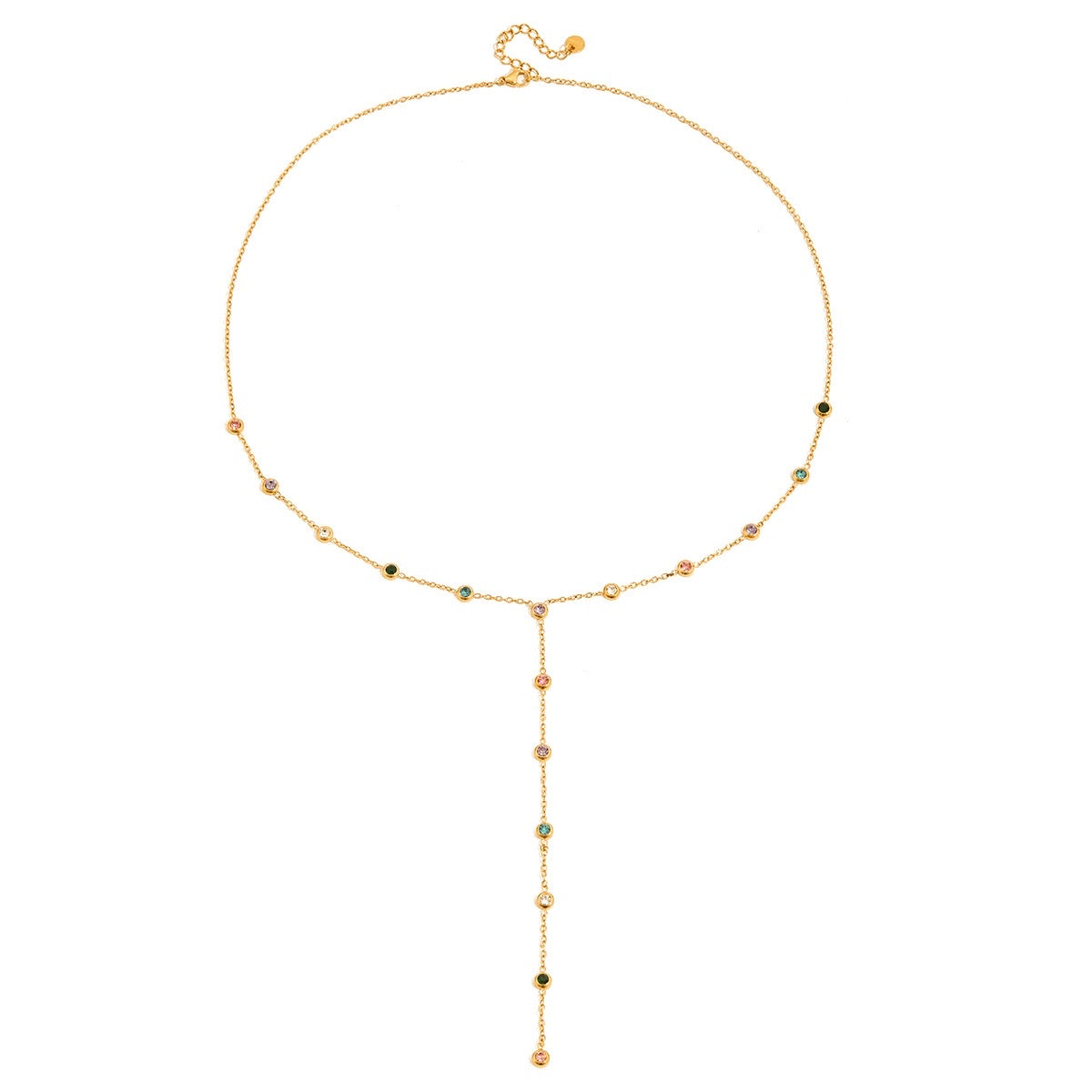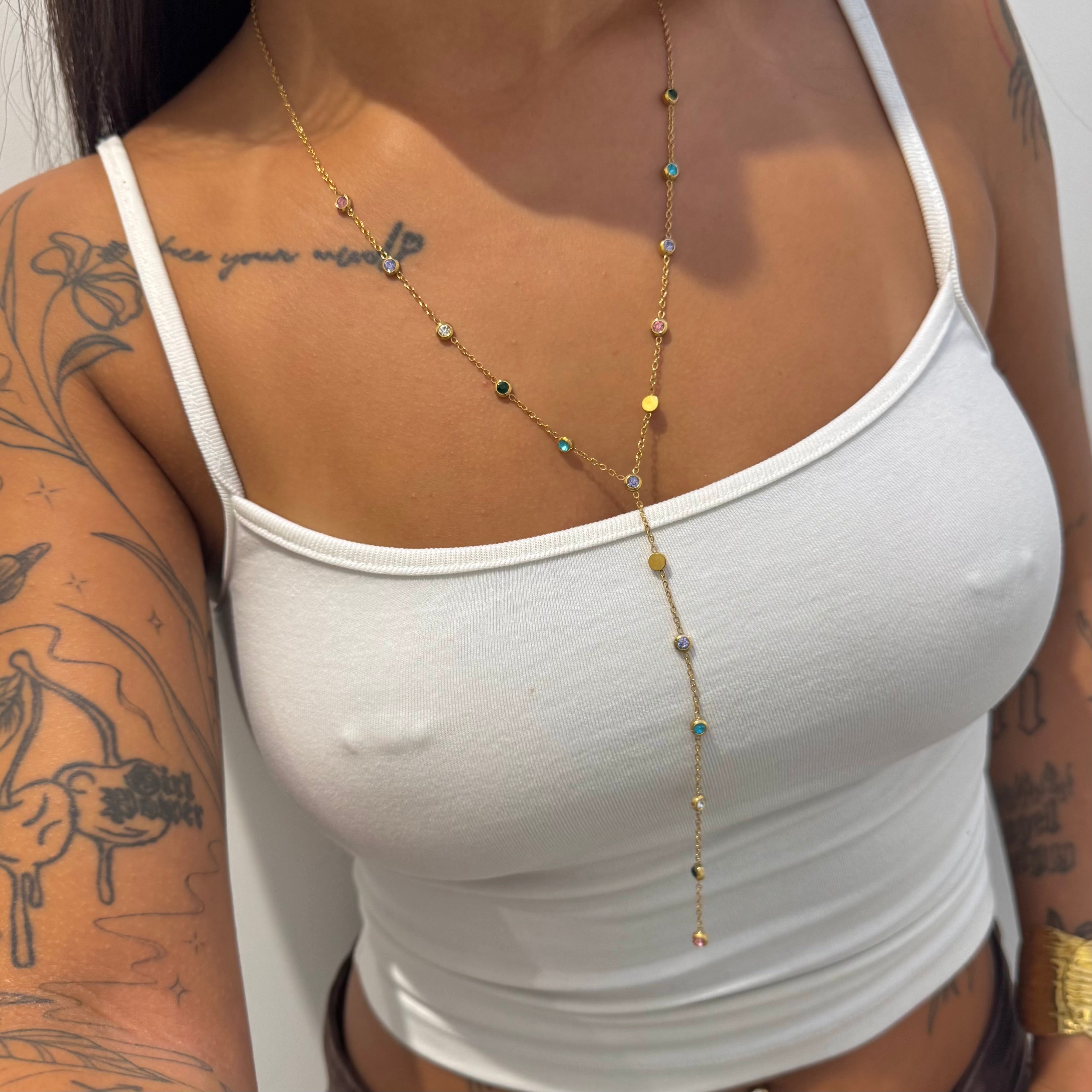 Our Alora Dangling Gemstone Necklace; a gorgeous dangling necklace featuring multi-coloured gemstones for everyday wear or dressing up. Layer it with your favourite necklaces to create the perfect stack ✨