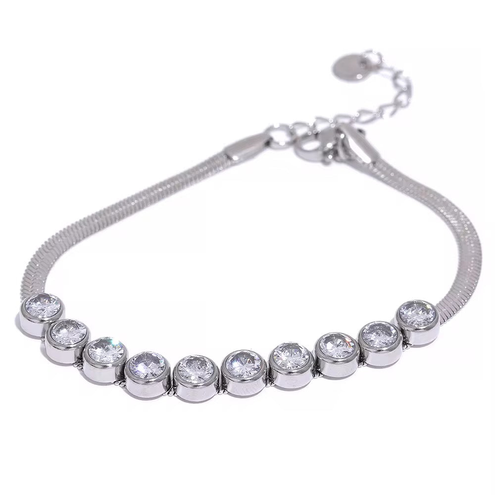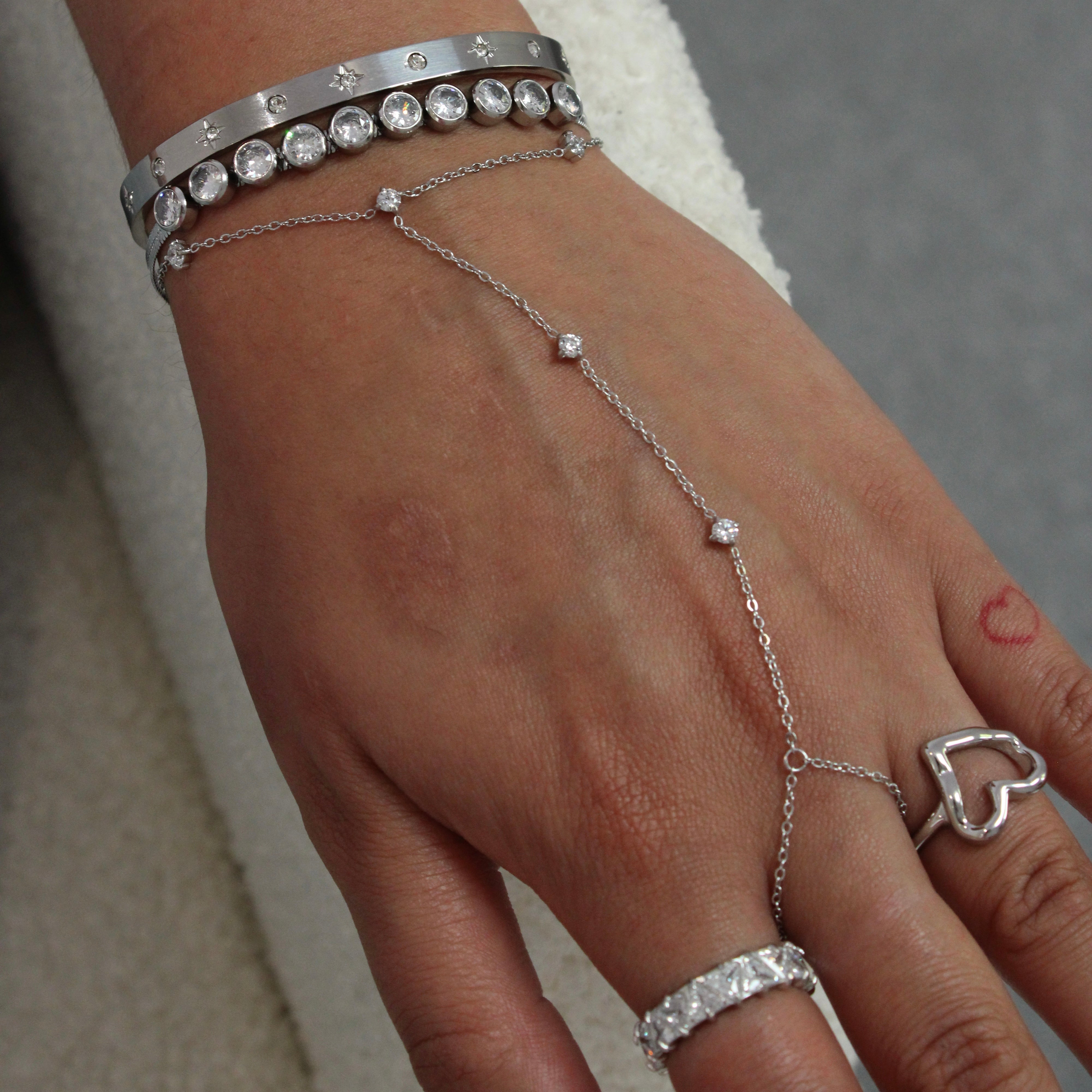 This silver bracelet features a row of gemstones, it brings glowy vibes to any look. This one is an instant favourite.