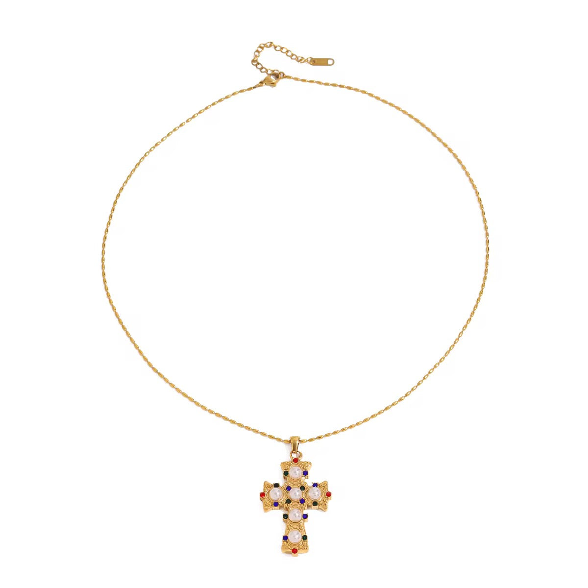 Bold and vibrant. This statement cross necklace with colourful gems and pearls inlaid is all about turning heads and stacking your pieces 🤍
